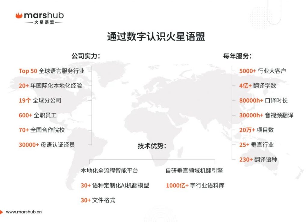 作為全球領(lǐng)先的數(shù)智化語言服務(wù)與技術(shù)解決方案提供商,火星語盟位列全球語言服務(wù)商第33名、亞太區(qū)第8名,穩(wěn)居國內(nèi)翻譯行業(yè)第一梯隊,年交付口筆譯項目20萬個,年翻譯字數(shù)超5億,覆蓋了英語、俄語、日語、法語、德語、西班牙語、葡萄牙語等230+語種,累計為全球5000多家中大型行業(yè)客戶提供多快好省的翻譯服務(wù),持續(xù)賦能國際工程、醫(yī)療健康、制造業(yè)、大文娛、法律、財經(jīng)等領(lǐng)域的全球化戰(zhàn)略落地。